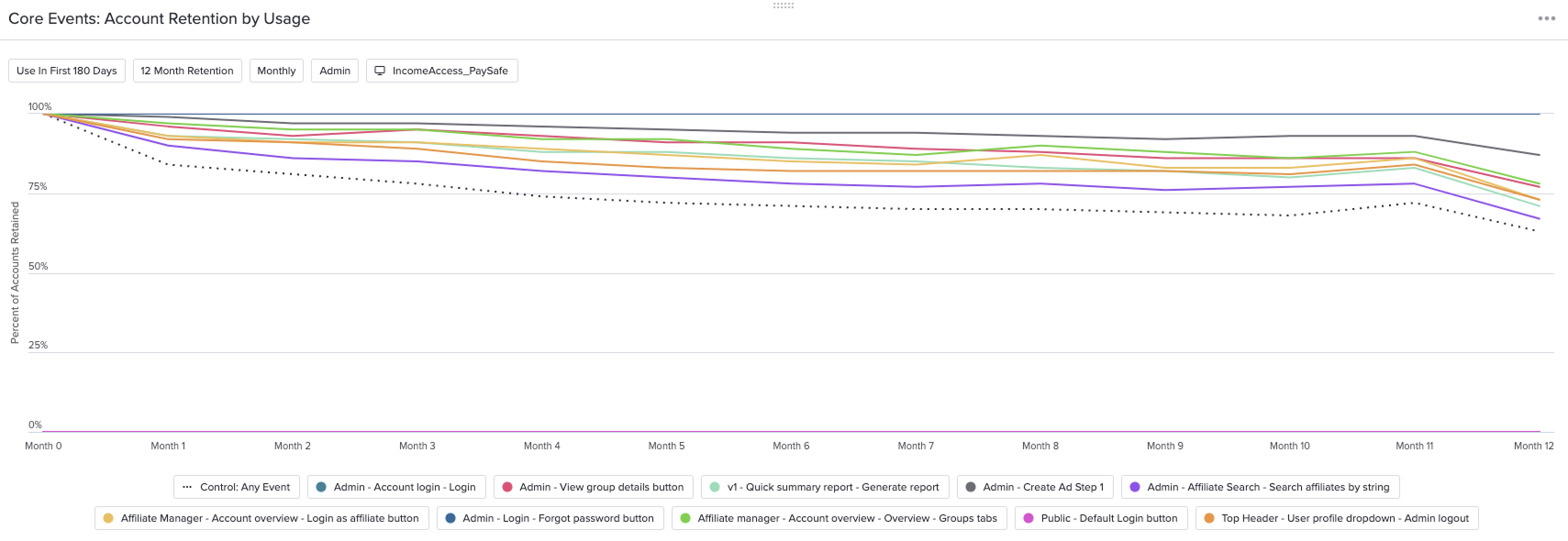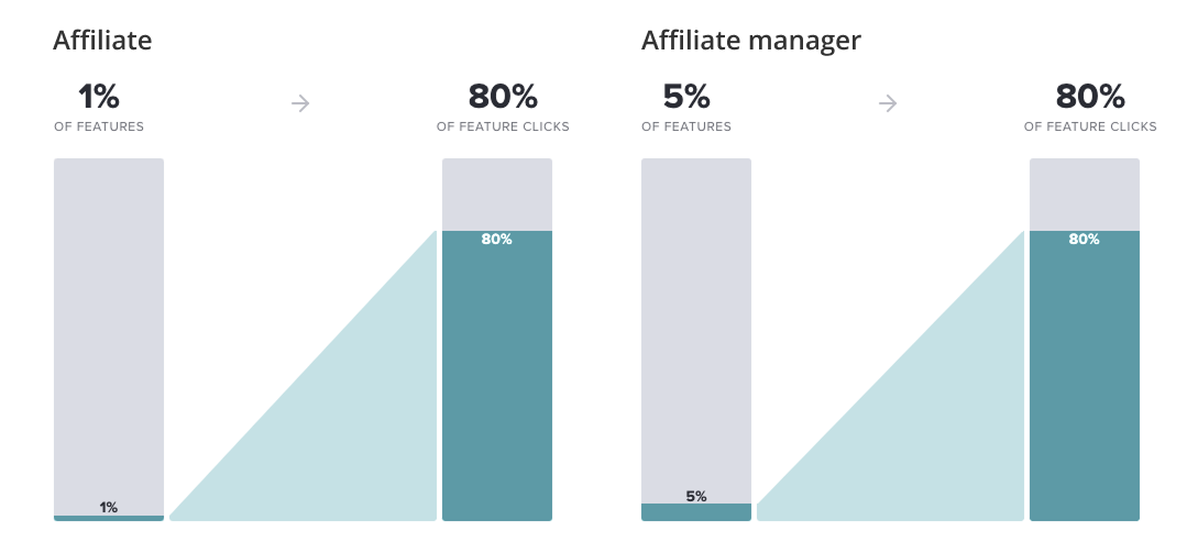 Using Pendo, we uncovered behavioral patterns that reshaped the design strategy. Feature usage was highly concentrated. For affiliates, 1% of features drove 80% of interactions, while for affiliate managers, 5% accounted for the same level of usage.